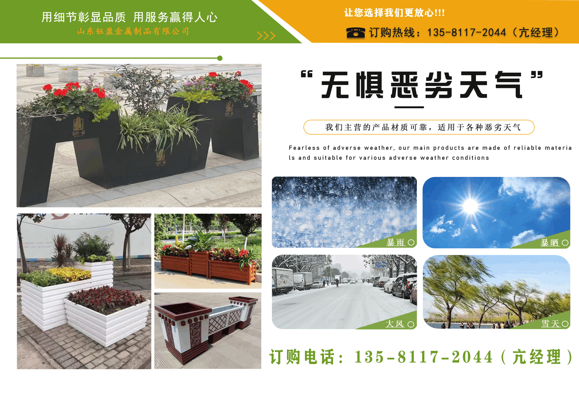 山東鈺盈金屬制品有限公司主營(yíng)鍍鋅板花箱,道路隔斷花箱,定制花箱,戶外道路花箱,花箱座椅等產(chǎn)品,產(chǎn)品結(jié)構(gòu)合理、性能優(yōu)良,具有強(qiáng)度高、耐腐蝕、抗老化、隔熱隔音、節(jié)約能源、外形美觀、使用壽命長(zhǎng)等優(yōu)點(diǎn),深受國(guó)內(nèi)外客戶認(rèn)可。 我們根據(jù)客戶所在城市的文化特征,制造出符合當(dāng)?shù)爻鞘形幕瘹庀⒌淖匀涣Ⅲw、觀賞性強(qiáng)的花箱產(chǎn)品成為城市里一道靚麗的風(fēng)景線。 公司實(shí)行誠(chéng)實(shí)、公正、守信、價(jià)格合理、平等互利。 公司憑借雄厚經(jīng)驗(yàn)實(shí)力,恪守誠(chéng)信為本的原則,得到了眾多客戶的信賴,并在業(yè)界獲得良好的口碑。建立了穩(wěn)固的合作關(guān)系,隨著業(yè)務(wù)的不斷發(fā)展和壯大,合作伙伴的范圍也在不斷擴(kuò)大。我們熱情盼望與您的合作,為社會(huì)的可持續(xù)發(fā)展獻(xiàn)上一份努力。...